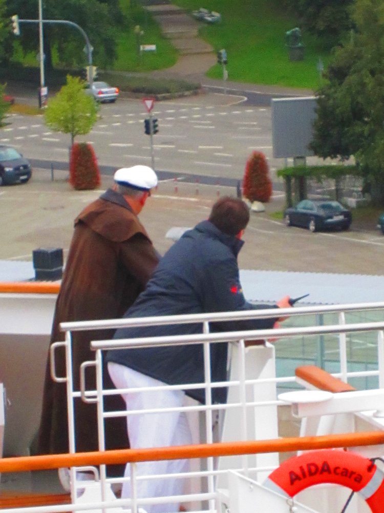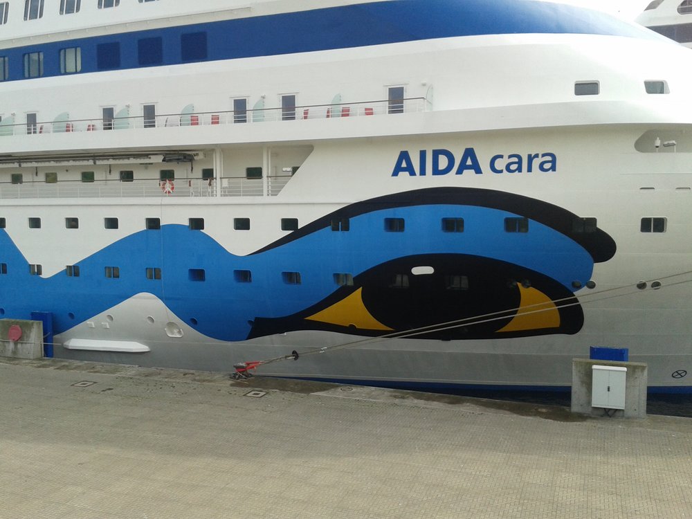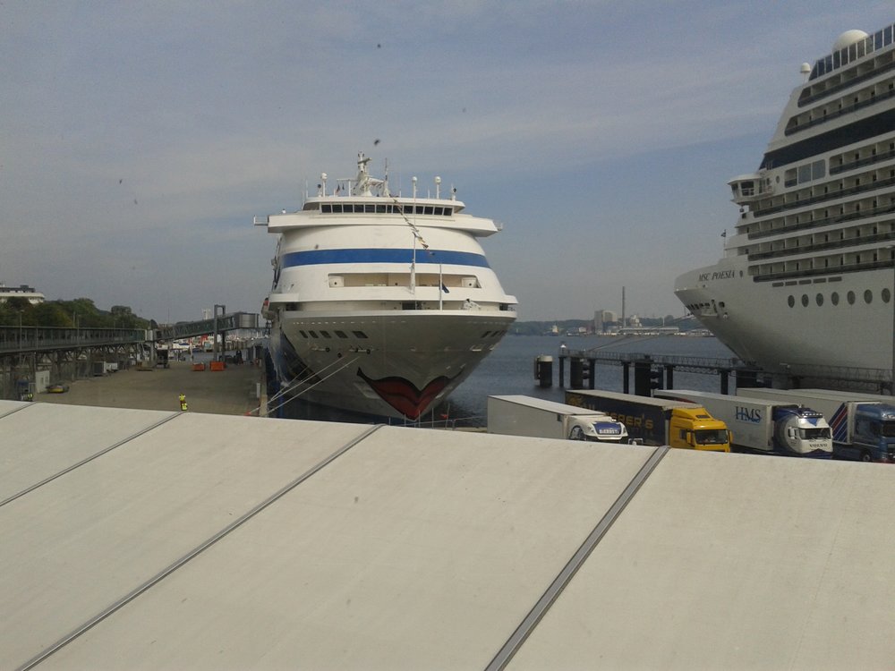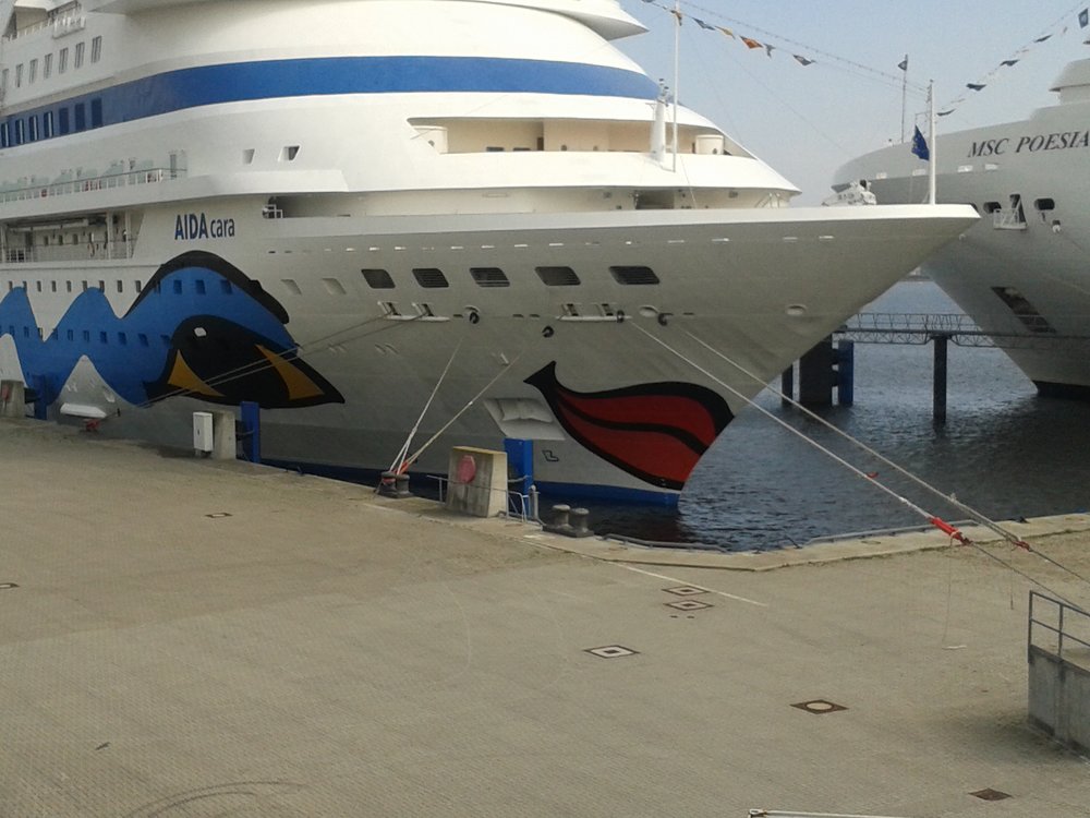 Nach Abgabe der Koffer am Bahnhof (deutsch perfektionierter Service) machten wir den Sparziergang zum Terminal im Kieler Hafen. Vorbei an einem Riesen-MSC-Koloss zur -eher beschaulich kleinen- Cara. Sie ist das älteste und kleinste Schiff der AIDA-Flotte, wir sind schon ganz gespannt. Am Terminal schnell noch eingereiht und die Bordkarten mit Foto gemacht ging’s dann auf das Schiff. Schöne Sicht von oben: