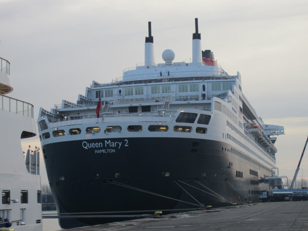 Nach diesem beeindruckenden Landgang durften wir dann noch den prominenten Besuch einige Liegeplätze weiter aus der Ferne betrachten, die Queen Mary II. Manch ein Schiffsfan reist für diesen Anblick extra nach Hamburg, wir hatten günstig ;-))