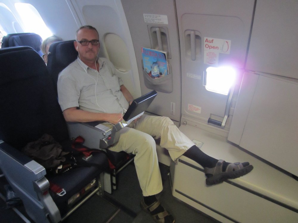 29.04., 4:45 Uhr der Wecker klingelt. Eigentlich keine Zeit zum Aufstehen! Wir hatten uns entschlossen, mit Bus und S-Bahn zum Flughafen DUS zu fahren und sind daher schon um 5:51 Uhr im Bus gesessen. Das durfte nicht fehlen: kurz vor Verlassen der Wohnung fing es an zu gießen wie aus Kübeln. Mit kleinem Schirm befaffnet ging’s ab zum Flughafen, wir sind ganz schön nass geworden. Der Flieger ist dann mit 45 Min. Verspätung los, irgendwelche Fracht musste wohl noch verstaut werden (es waren eine „Horde“ Schäferhunde, die mit uns flogen…..). Flugzeit: 9 Std. 20 Min. Rein in dieXL-Sitze und Zeit „absitzen“.