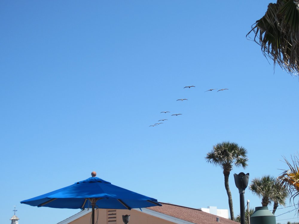 Nun gut, als Gäste des Hauses steht uns natürlich auch der Besuch des Pools zu, was wir auch taten und uns unter dem Schirm ein schattiges Plätzchen einverleibten. Wir hielten bis ca. 16.00 Uhr aus, mal im Wasser, mal davor, um dann langsam diesen Strandtag ausklingen zu lassen. Der Plan sieht nun vor, Morgen nach Cape Canaveral zu fahren und übermorgen das Kennedy Space Center zu besuchen. Hoffentlich hat der Jetty Park noch einen Stellplatz für die 2 Nächte für uns. Einige Reservierungen gehen dann nämlich ausschließlich telefonisch und unsere Handys sind -warum auch immer- out of phone. Obwohl SMS etc. funtkioniert. Liegt vielleicht am Aldi-Tarif oder deren Anbieter. Nicht ganz so wichtig, da wir via Whatsapp, Email und hiermit mit der Heimat Verbindung halten. Ach ja: wir haben ja Urlaub, da passt das mit der „Nichterreichbarkeit“ (lieben Gruß an die KollegInnen!!) ja auch ganz gut ;-)). So, hier nun die wenigen heute geschossenne Fotos vom Pool und den (wirklich genial anzuschauenden) segelnden Pelikanen. Die haben so tollen Aufwind, dass kaum einer mit den Flügeln schlagen muss. Energetisch voll korrekt eh.