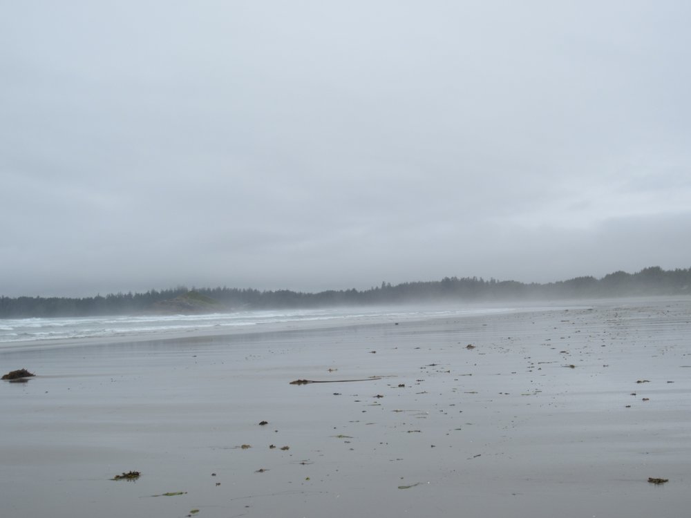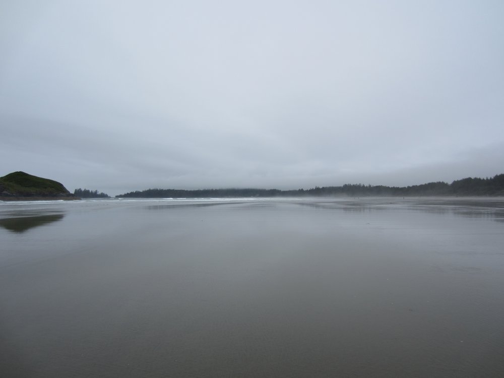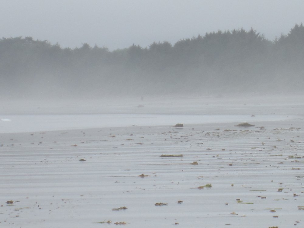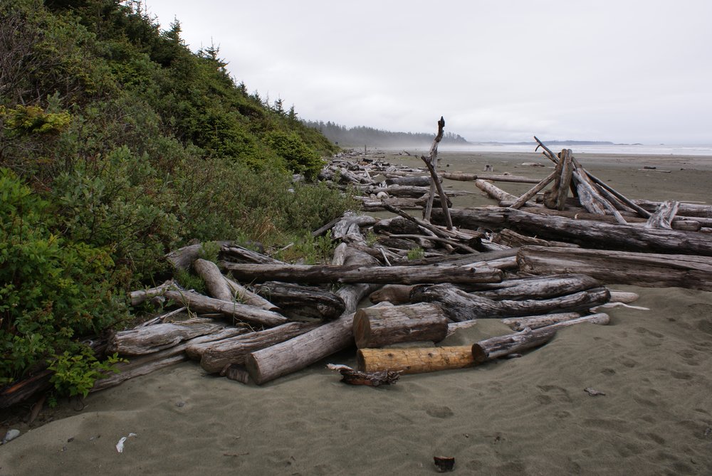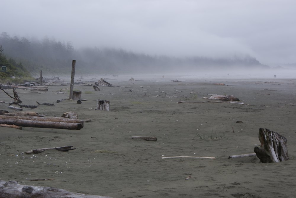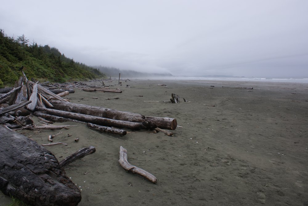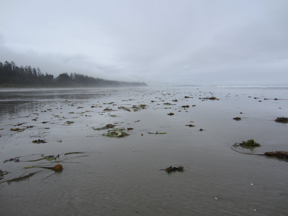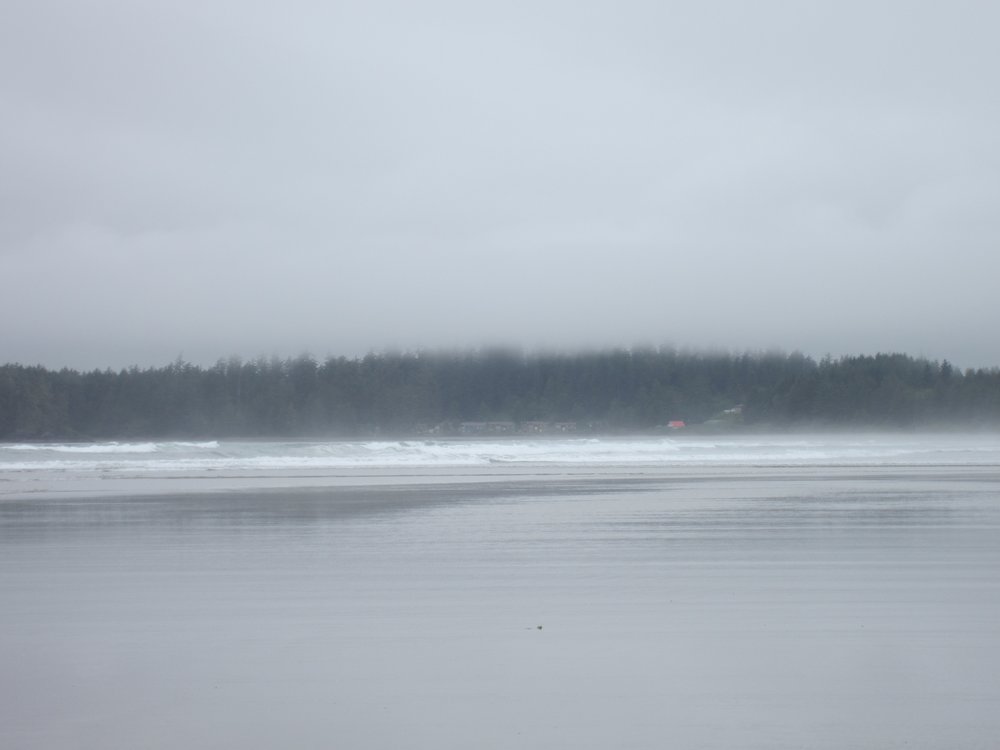 Das war schon ganz schön wildromantisch. Das Wetter hat sich gegen Ende der Tour auch so langsam bekrabbelt. Wir sind dann weiter Richtung Tofino, entlang des „Pacific Rim NP“ gefahren und haben unterwegs den „Rainforest Trail“ passiert (evtl. am nächsten Tag?) und sind am „Long Beach“ (guckst Du auch: http://www.longbeachmaps.com/) an den Strand. Das Wetter war noch diesig, hier am Wasser noch ein wenig mehr. Guckst Du Bilder: