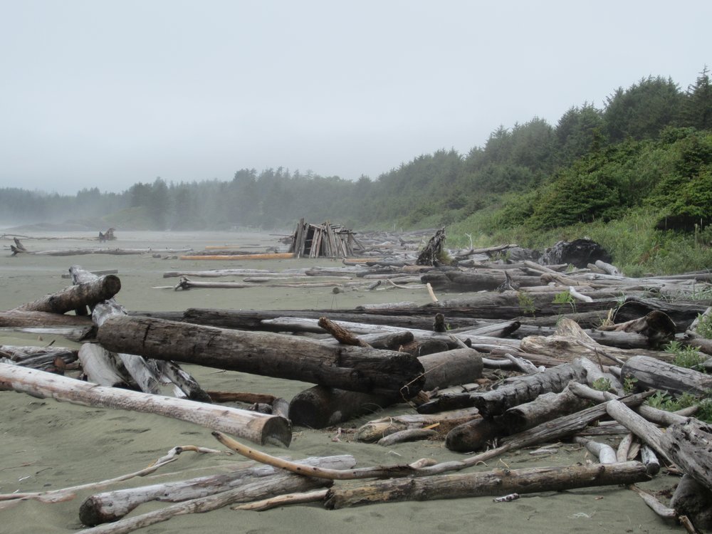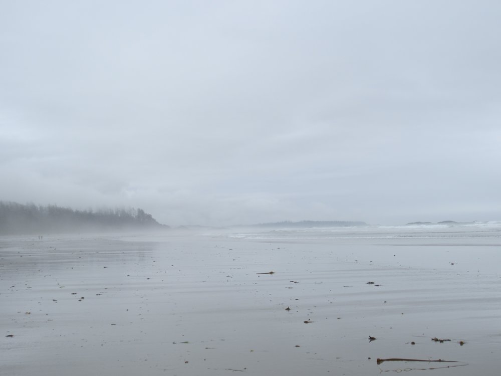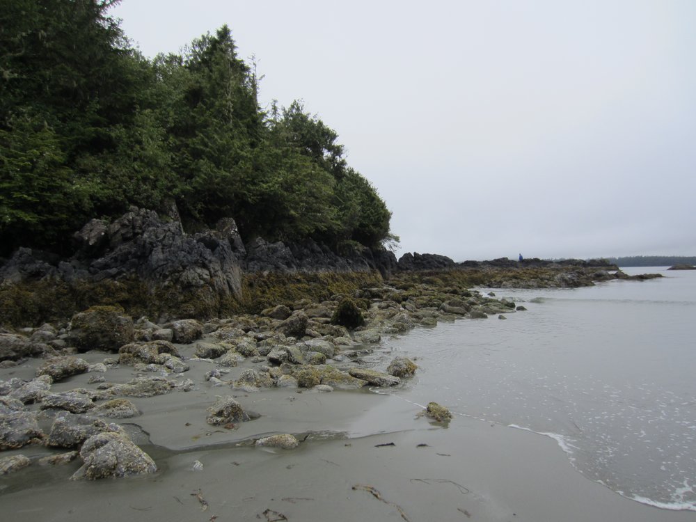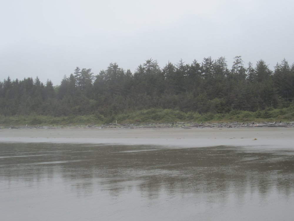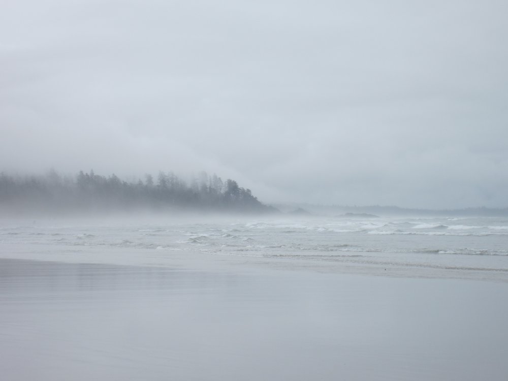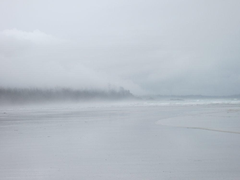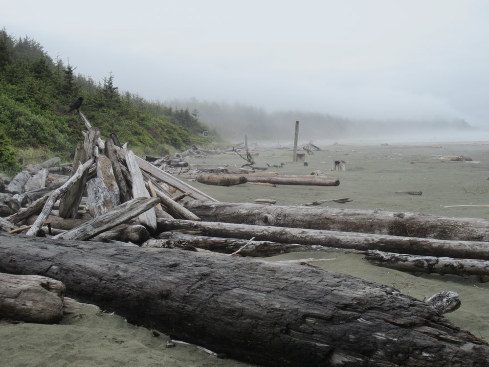 Das war schon ganz schön wildromantisch. Das Wetter hat sich gegen Ende der Tour auch so langsam bekrabbelt. Wir sind dann weiter Richtung Tofino, entlang des „Pacific Rim NP“ gefahren und haben unterwegs den „Rainforest Trail“ passiert (evtl. am nächsten Tag?) und sind am „Long Beach“ (guckst Du auch: http://www.longbeachmaps.com/) an den Strand. Das Wetter war noch diesig, hier am Wasser noch ein wenig mehr. Guckst Du Bilder: