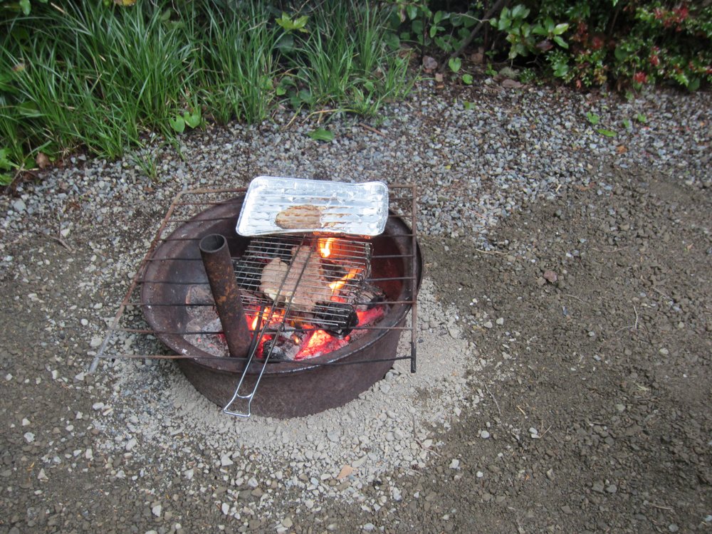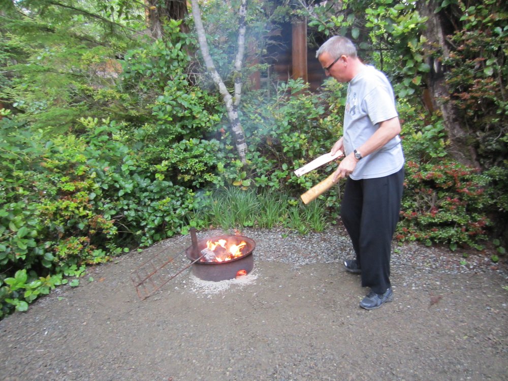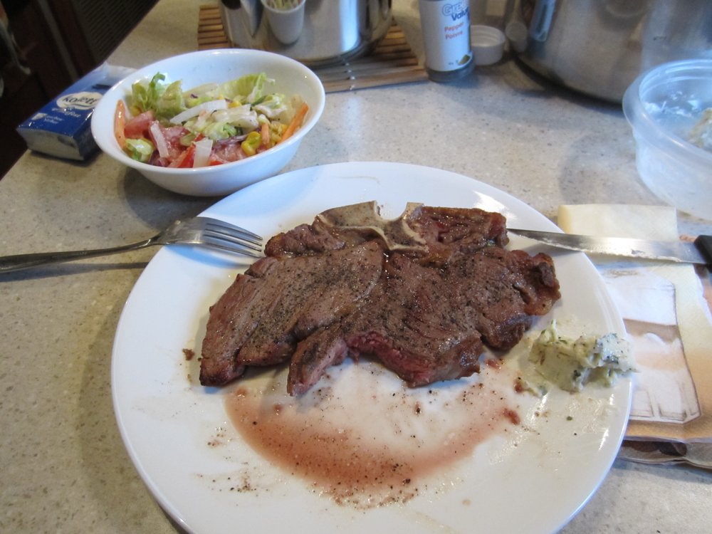 Das nenn ich mal einen gepflegten Platz! So sauber, tip-top in Schuss. Am Strand begegnete uns wieder der Rabe. Nebenan war ein Hotel mit merkwürdig aussehenden Cottages, halbrund gebaut. Das Wetter war stabil und so konnte der Holzmeister ein Feuerchen machen und ein kleines Stückchen T-Bone Steak grillen :-). Vorher hatten wir noch Besuch von einem (weiteren?) „komischen Vogel“ (amerik. Kuckuck, glaube ich).