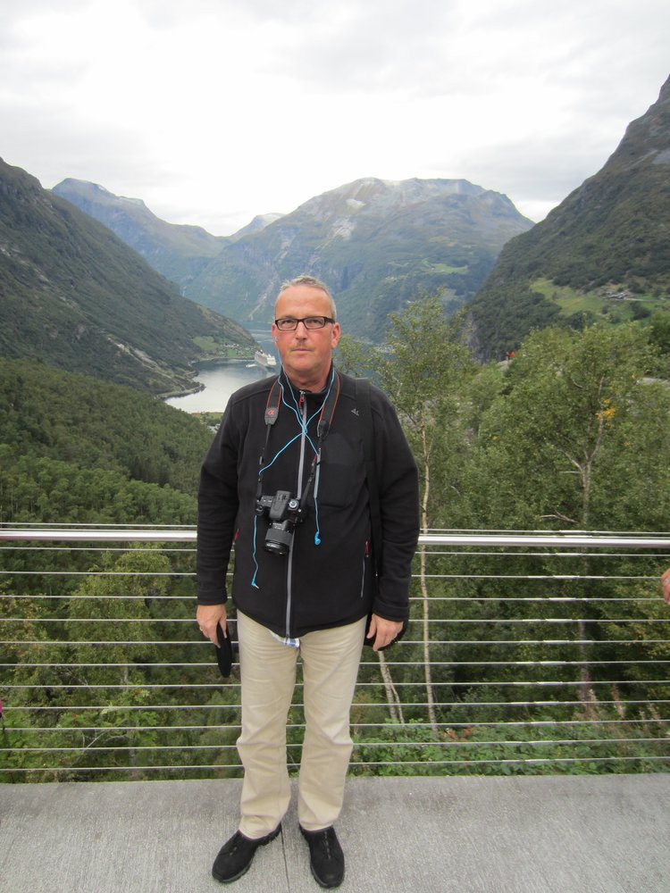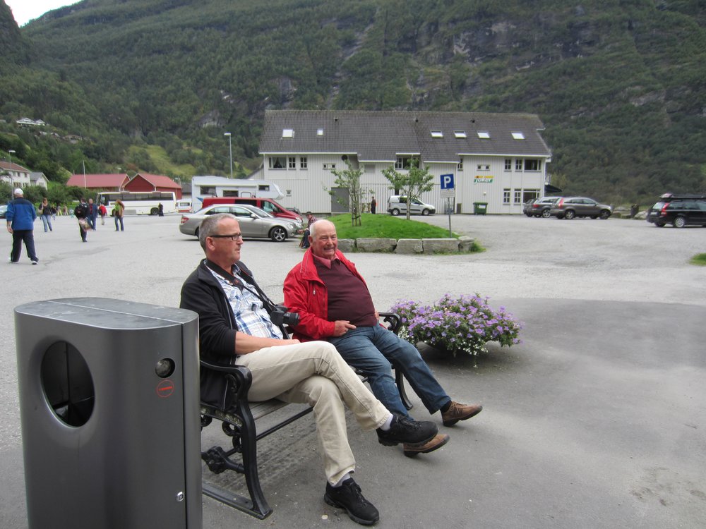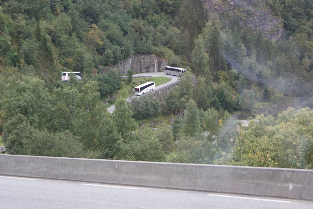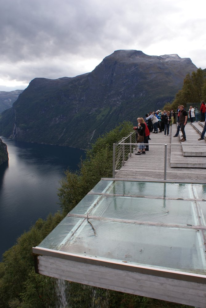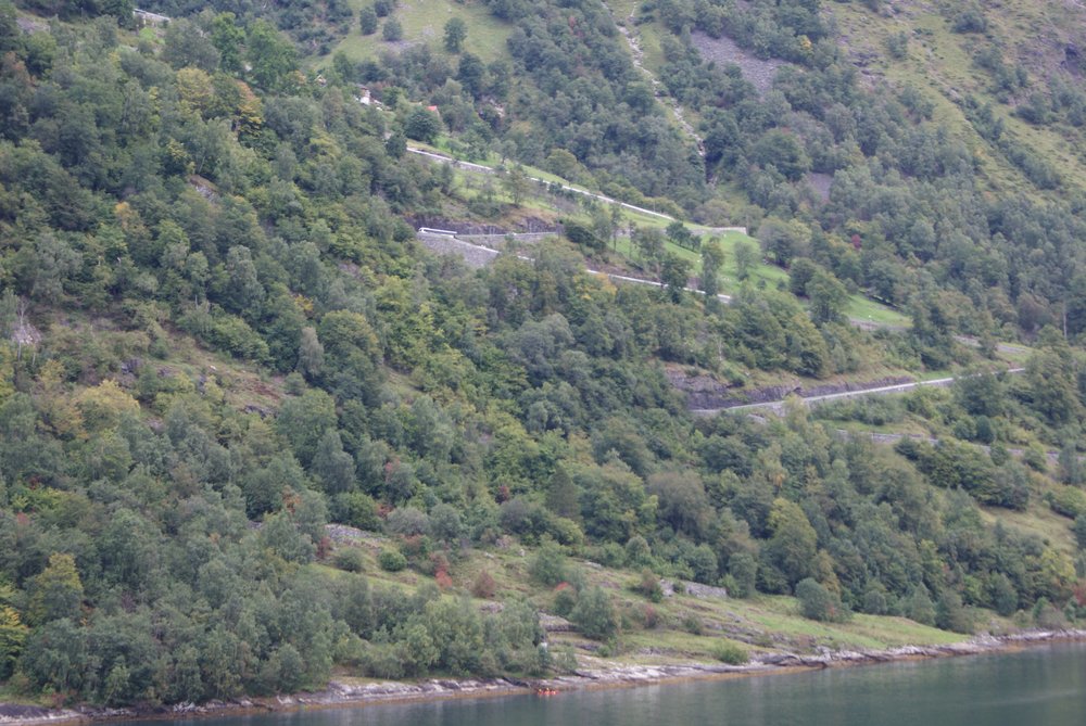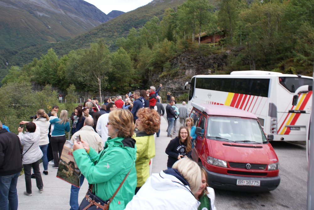 Der Blick war schon mal toll. Nach ca. 15 Minuten kam der Bus zurück und sammelte uns wieder ein. Es ging nun entgegengesetzt Richtung Adlerkehre, über die „11 Serpentinen“, welche nahezu alle 180° Kurven sind. Nix für nervenschwache. Hinter uns die netten Gäste aus Frechen, er: „Schatz, häste dir jetz in de Butz jemaat?“. Wir hielten uns den Bauch vor lachen! Oben angekommen gab’s einen wirklich genialen Blick auf Geirenager, die Schiffe, und die sieben Schwestern, guckst Du Bilder: