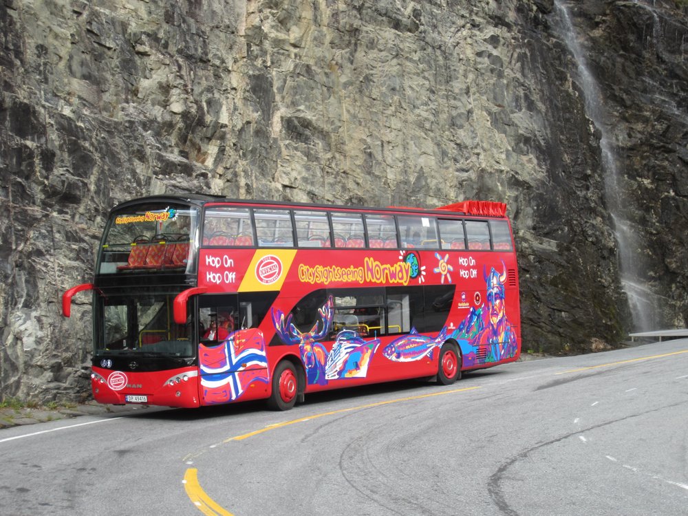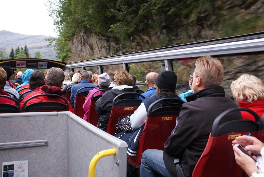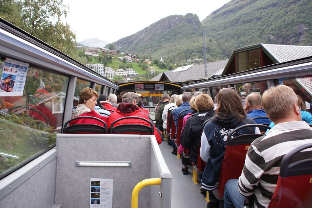 Geiranger hat 300 Einwohner und die wurden an diesem Tag von ca. 4 tausend Kreuzfahrern heimgesucht. Hat sich aber alles verlaufen, bis auf die Hafenstrasse, dort waren 5 Shops und die Tourist-Info. Wir kauften ein „Hop on, Hop off“ -Ticket und fuhren dann mit diesem Bus -oben offen- zu den 2 Aussichtspunkten, hier Bilder vom ersten Punkt oberhalb Geiranger mit Blick auf den Ort und in den Fjord hinein, guckst Du Bilder: