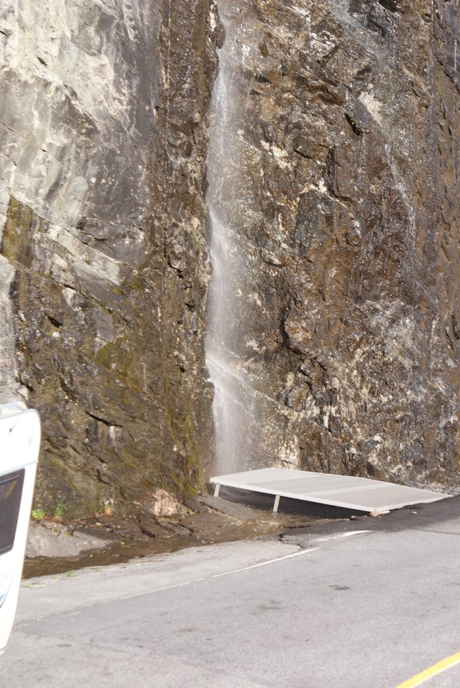 Im Anschluß an die Tour zu den zwei Aussichtspunkten gingen wir noch dem Fluß bergauf folgend am Wasserfall entlang, der sich fast quer durch das Dorf zog. Am oberen Ende war das dingens-Musem, in dem die geschichtliche Entstehung eines Fjordes erklärt wird. Da wir ziemlich geschafft waren, sind wir nicht reingegangen, sondern sind umgekehrt Richtung Schiff. Unten war übrigens ein Campingplatz mit dem atemberaubendsten Ausblick seit langem. Der wird nur noch durch „Devils Garden“ im Arches, Utah getoppt. Guckst Du ein paar Bilder: