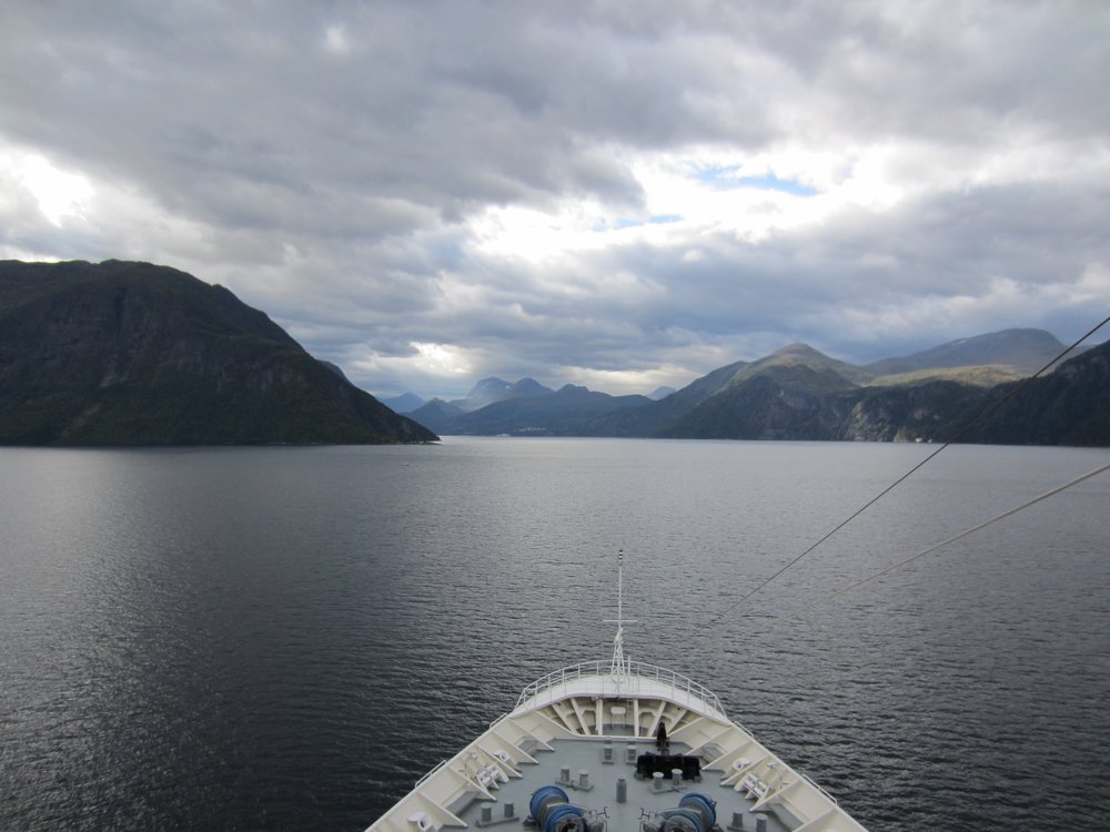 da simmer widder. Im Fernsehen werden immer in einer Endlosschleife die Touren vorgestellt und so schnappten wir auf, dass man ab ca. 2 Std. vor dem Anlegen auf Deck die Einfahrt in diesen Fjord anschauen sollte. Birgit hat das „ab“ wohl nicht gehört und so standen wir 3,5 Stunden an Deck, erste Reihe bei sch….. Wind! Es war kalt.