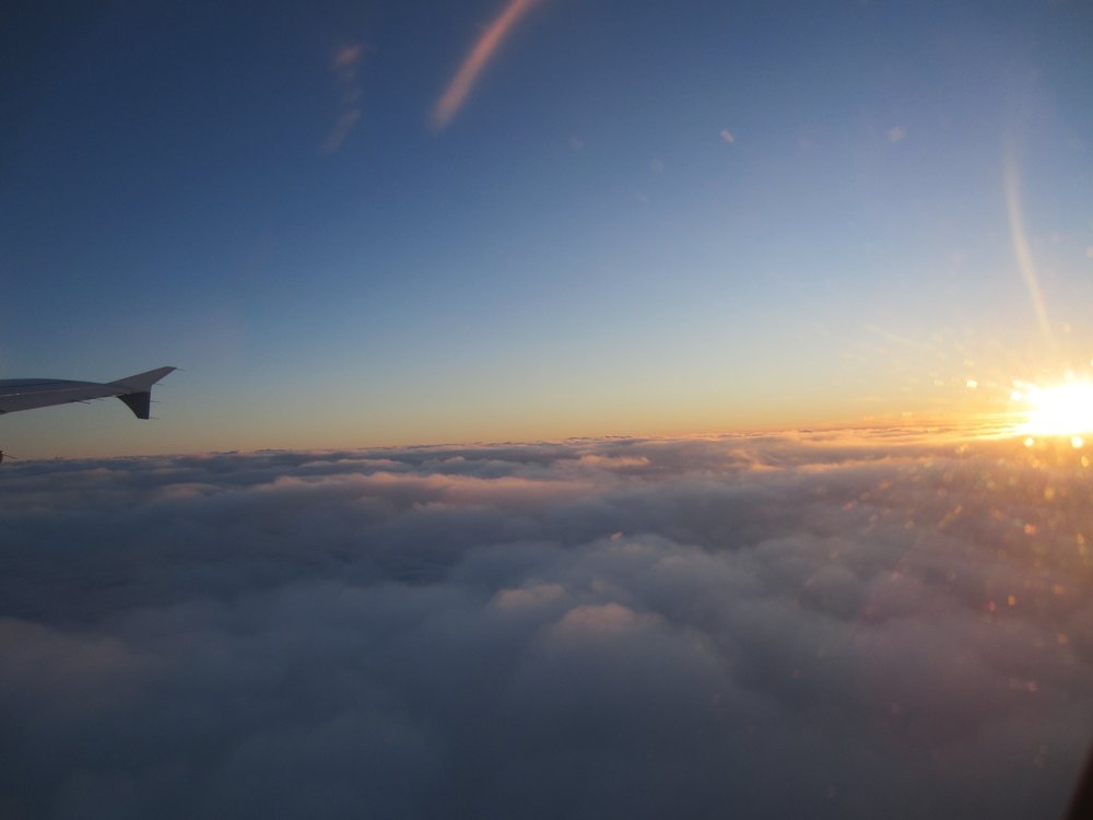 Der Flieger ging pünktlich und wir bekamen über den Wolken einen schicken Sonnenaufgang zu sehen. Toll, guckst Du Bilder: