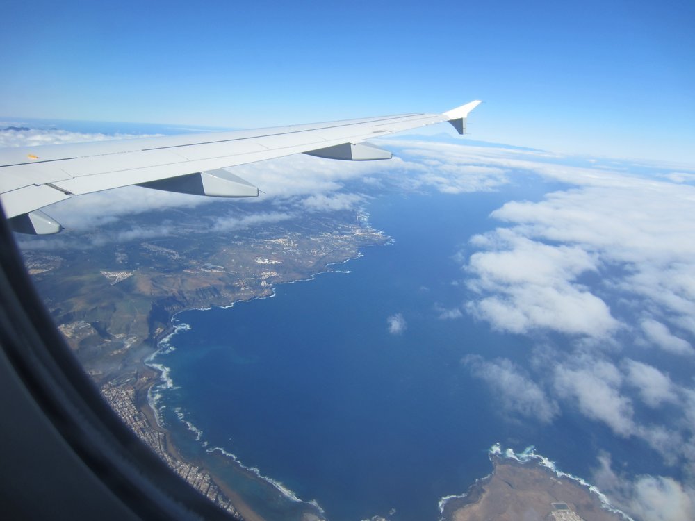 Leider hat Germanwings nirgends Bildschirme o.ä., wo man sehen kann, wo man sich gerade befindet in der Luft. So kam erst sehr spät die Info, dass wir tatsächlich über Paris, den Pyrenäen und entlang der portugisischen Küste flogen (bin mir sicher, dass ich die letzte Currywurst vor Amerika gesehen habe….), bis wir dann Richtung Gran Canaria „abbogen“.