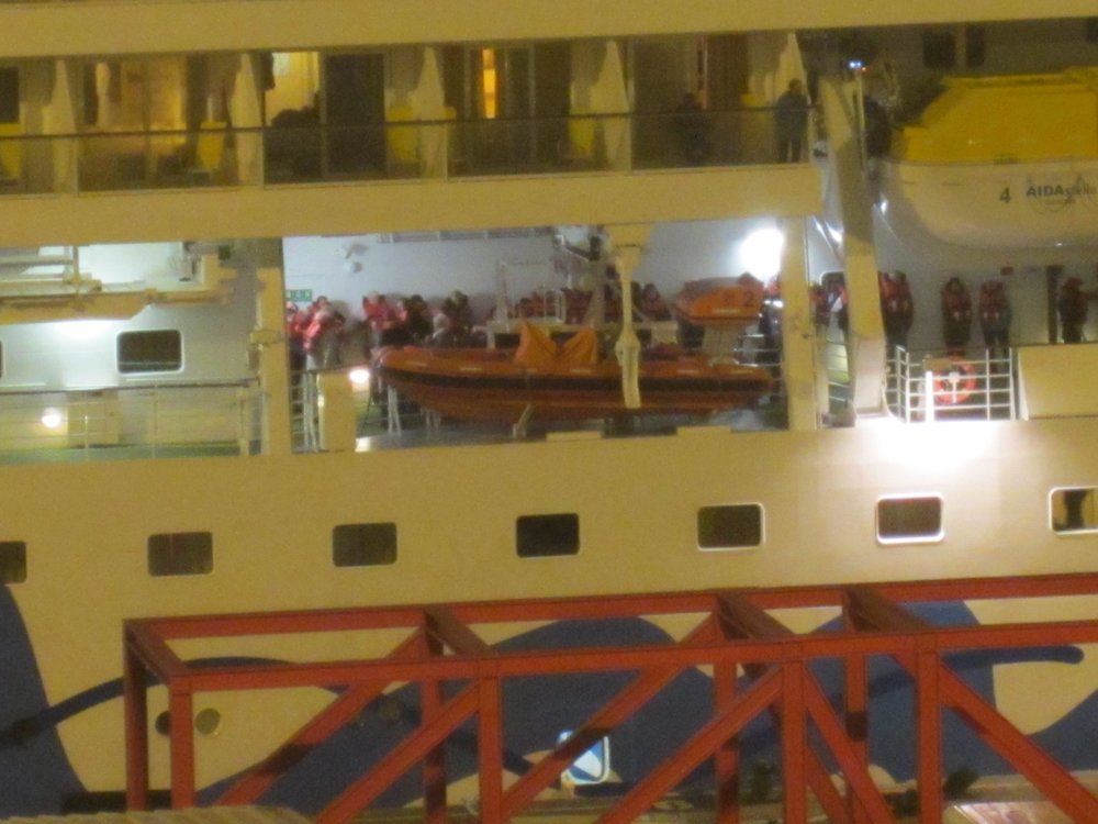 Dort trafen wir gegen 17.30 Axel (Güttler, unser Reisebürochef des Vertrauens….). Wir klönten noch etwas mit anderen Teilnehmern der Reisegruppe und trennten uns dann zum Abendessen, uns war nach Buffetrestaurant. Danach konnten wir auf der Stella die Sicherheitsübung –alle mit Schwimmwesten- gegenüber beschauen. 15 Min. später mussten wir ran. Aber anders: ohne Weste mussten wir uns an einem Sammelpunkt (innen, in einer großen Bar) treffen. Dann hat man uns den Sicherheitsfilm vorgeführt, der sowieso im Bordfernsehen nonstop läuft. Hm.