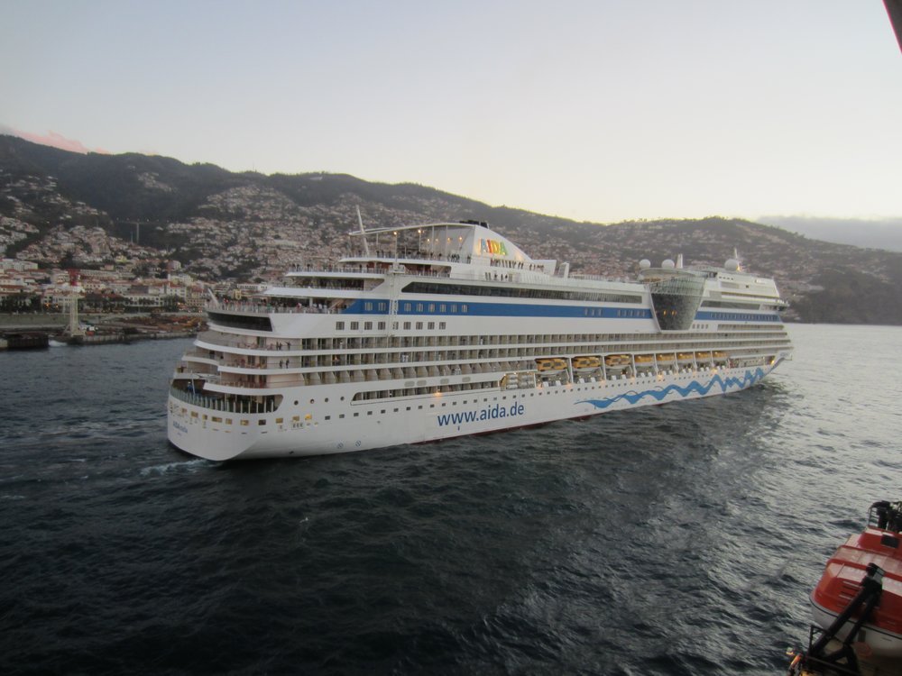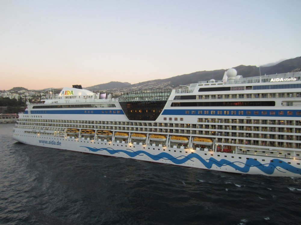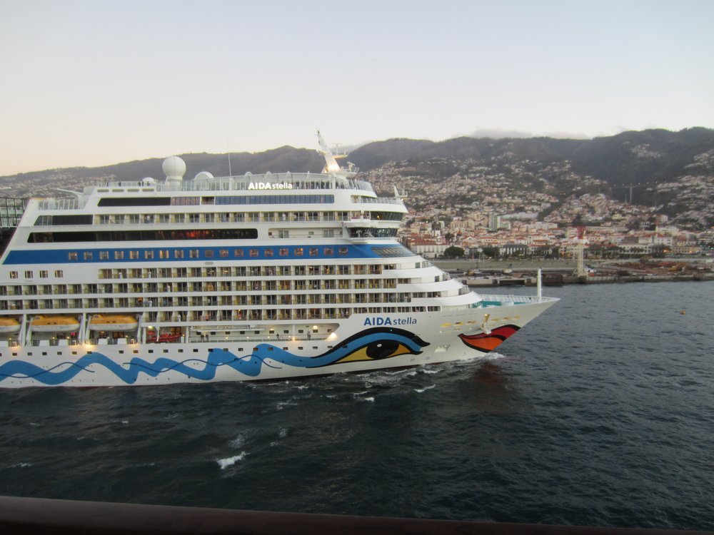 der zweite Tag in Funchal bedeutete früh aufstehen, wollte ich doch tauchen gehen. Nachdem wir vom Balkon aus die AIDA Stella vorbeifahren sahen, gingen wir frühstücken. Anschließend traf ich mich mit den anderen 2 Tauchern, unserem Guide Sophia und einem weiteren Gast aus der Crew am Schalter und gingen zum Transfer von Bord. Dieser klappte dann auch reibungslos und nach knapp 25 Minuten Autofahrt -zum Teil mit toller Aussicht über die Bucht, den Hafen und unser Schiff- kamen wir in der Bucht „Praia do Garajau“ an. Bevor es steile Serpentinen in die Bucht hinunter geht, kann man noch die Christusstatue (so eine wie in Rio und Lissabon) sehen, deren drei Blicke sich irgendow kreuzen sollen, behaupten die Portugiesen 🙂