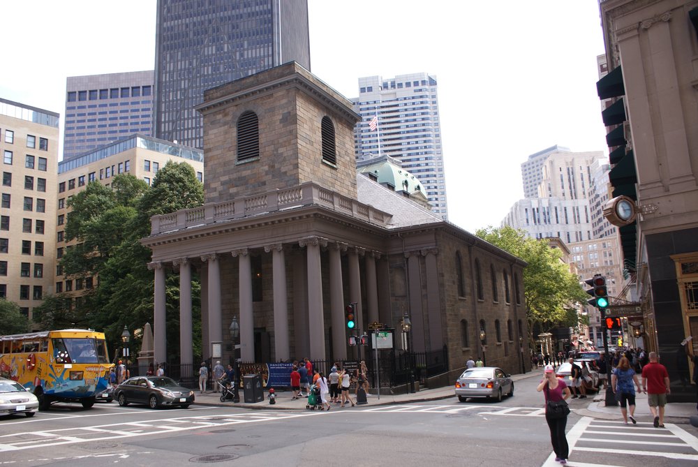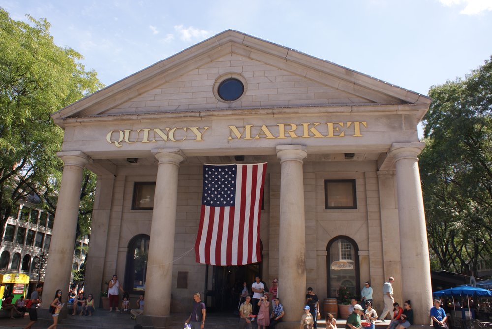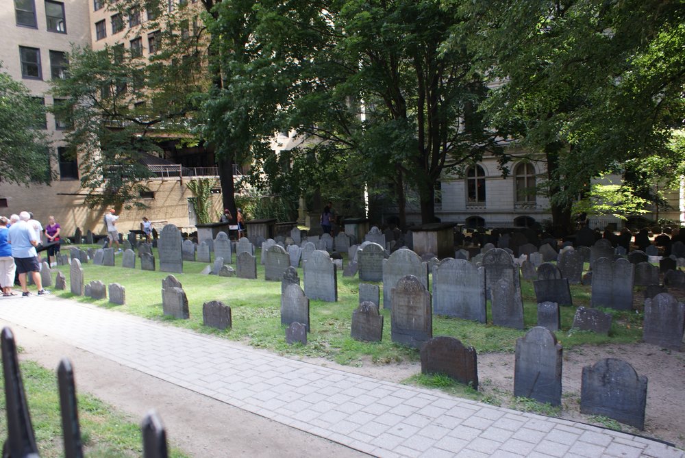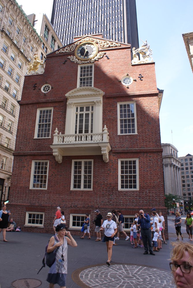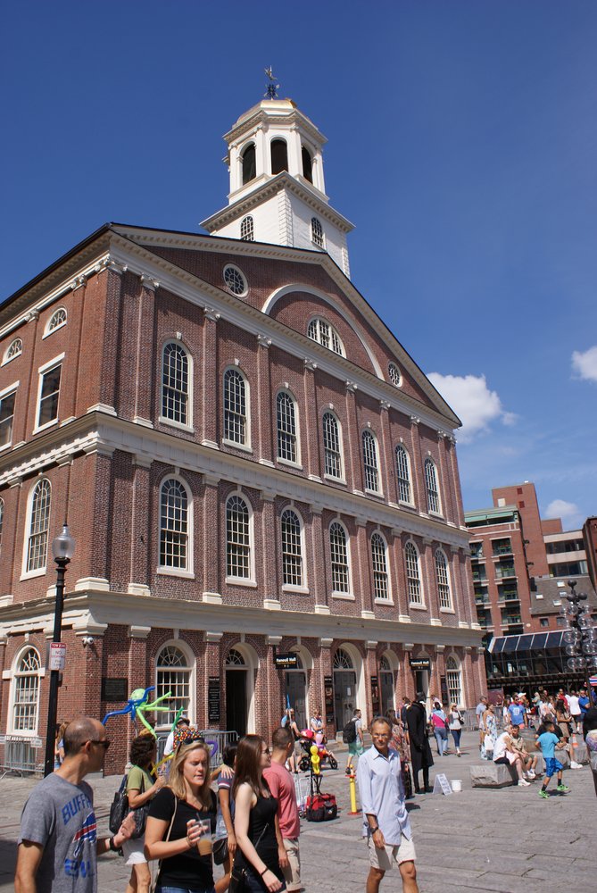 Wir hatten den „Freedom Trail“ im Auge und natürlich der (fast schon übliche) Besuch des HRC Boston, wo wir dann auch wieder online sein konnten. Das man übrigens nicht nur dort, auch bei Mäckes, Starbucks und anderen Restaurantketten oder Shops kann man sich einwählen. Echt praktisch. Direkt vor dem Schiff hätten wir den Trolley nehmen können, eine Art Bimmelbahn mit offenen Fenstern zum Sightseeing. Da wir aber noch einiges an Bewegungsmangel zu verzeichnen hatten, gingen wir zu Fuß los. (tolle Formulierung, oder?). Nach ca. 1,5 Std. sind wir dann –einmal quer durch die Stadt- am „Boston Common“ angekommen, der älteste öffentliche Park der USA und Start des Freedom Trails. Am oberen Ende Stand der ehemalige Gouverneurs-Palast, das Massachusetts State House. Der Trail führt einen zu 17 Sehenswürdigkeiten, die meist alle mit dem Thema Unabhängigkeit und den damit verbundenen Unruhen zu tun hatte. Sehr interessant kann ich Euch sagen. Für die Touris ganz praktisch: um den Trail folgen zu können, hat man in die Bürgersteige und Straßenkreuzungen rote Backsteine eingelassen, so habe selbst ich es geschafft, dieser Spur zu folgen 🙂 .Wir sind bis zur 12. Station gekommen (Faneuil Hall mit Quincy Market), als das HRC auf dem Weg lag.