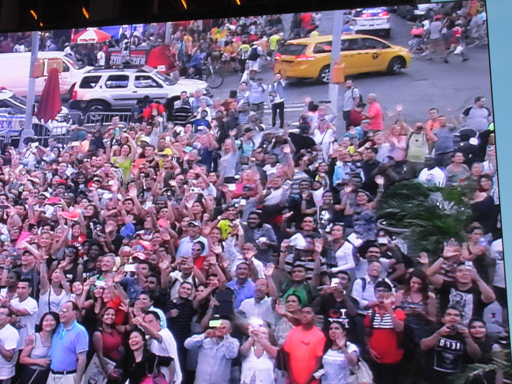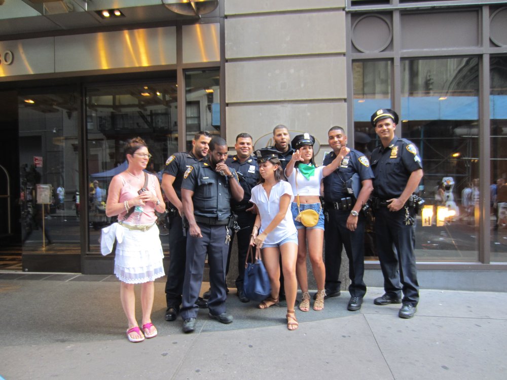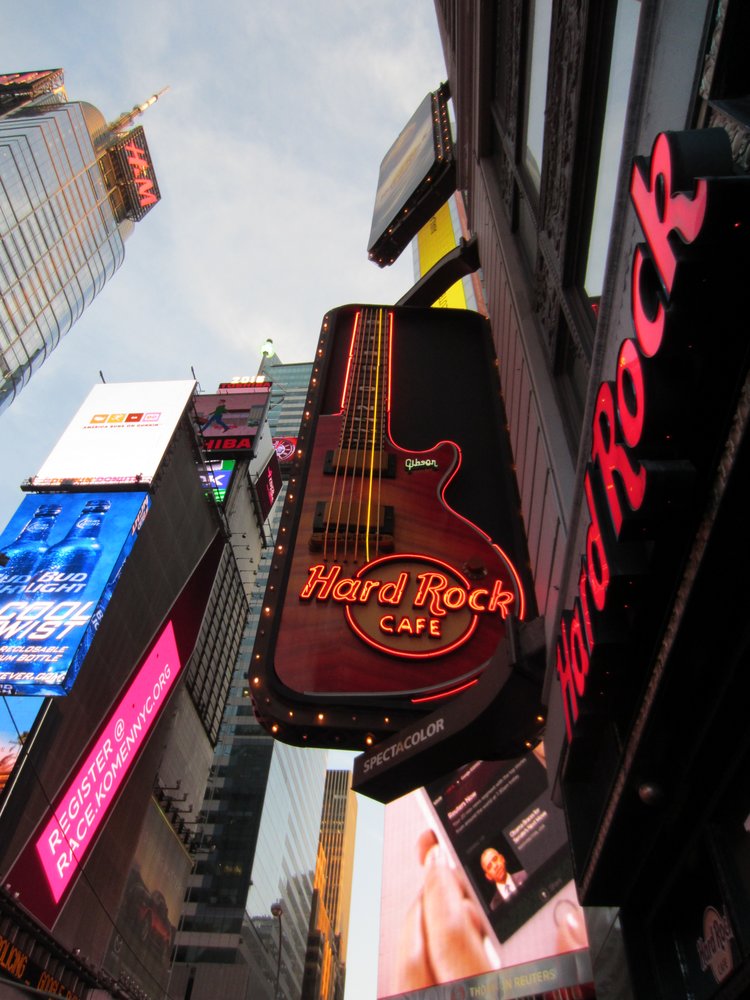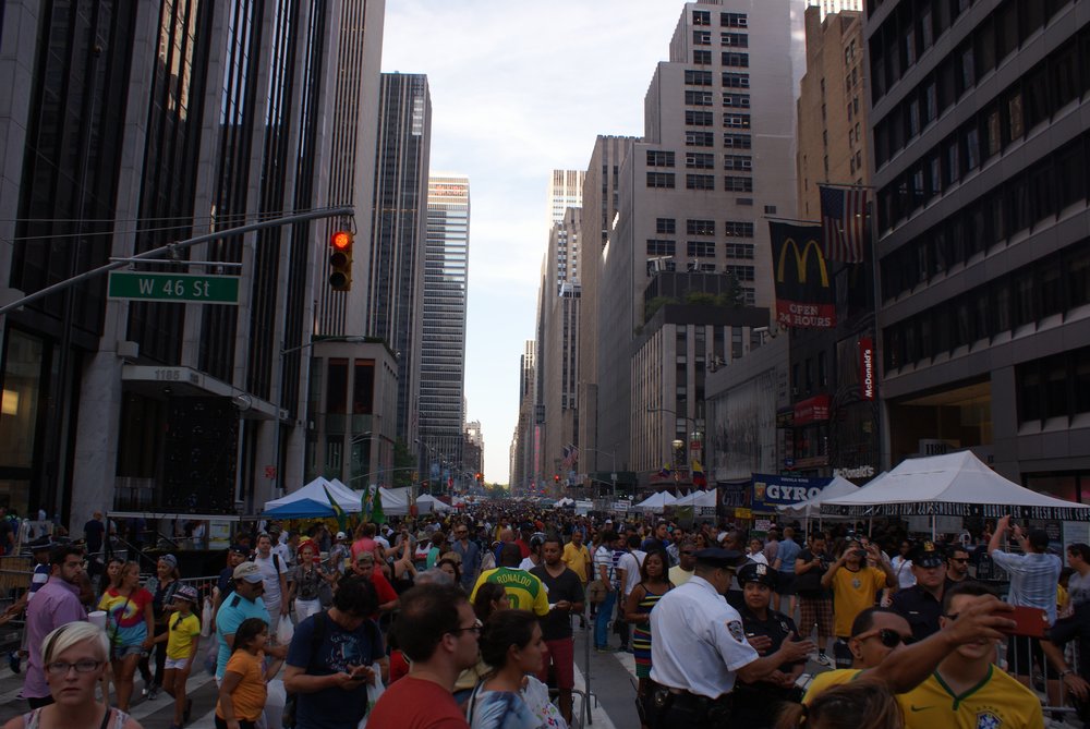 Nach diesen Bildern gingen wir noch bis an den Rand des Central Park und kehrten dann wieder um. Denn auf der gesperrten Straße (immerhin 4-spurig, wie fast Alles hier 🙂 ) feierte man den „Brasilian day“ (guckst Du: http://www.brazilianday.com ). Das war ein riesiges Strassenfest mit Live Musik und unendlich vielen Buden, wow. Echt crazy. Wir genossen es, hier entlang zu schlendern und hatten viel Spaß. Auch einen Grillspieß gab’s 🙂 . Zum Entspannen machten wir ein kleines Päuschen im HRC. Dort gegenüber gab es dann eine Show der besonderen Art: Auf dem Riesendisplay waren die Leute unten zu sehen und winkten sich zu (guckst Du: http://www.revlon.com/loveison) . Das war witzig, guckst Du Bilder auch davon: