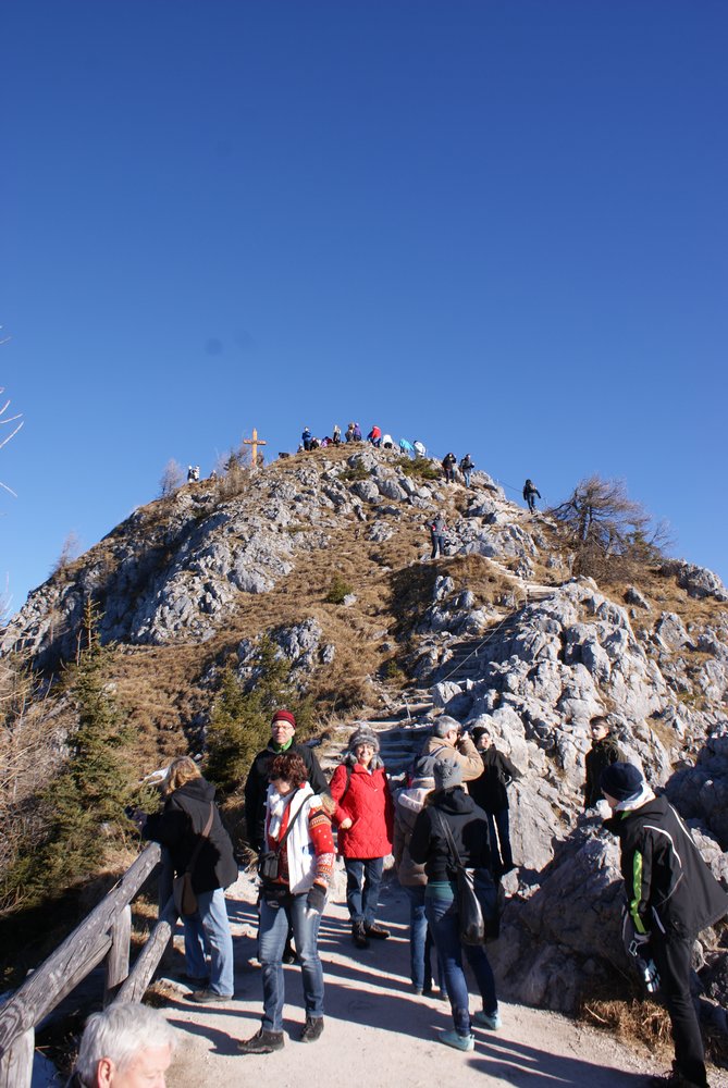 Es kam natürlich anders. Als wir oben an der Bergstation ankamen, gingen wir weiter bergauf zur Aussichtsplattform, die letzten Meter zum Gipfelkreuz haben wir uns geklemmt. Bei diesem verdammt guten Wetter waren einfach zuviele Menschen unterwegs und die letzten Meter aus unserer Sicht der Weg zu schmal 🙂 Das liegt nicht an unserer Figur… Das ist Massentourismus pur, wobei wir ja auch ein Teil dessen sind. Also haben wir an der Aussichtsplattform unsere Fotos geschossen und sind dann wieder hinab zur Bergstation gegangen. Der Weg hat übrigens kein Geländer wie ihr auf den Bildern gut sehen könnt. Ach ja, Bilder. Guckst Du hier: