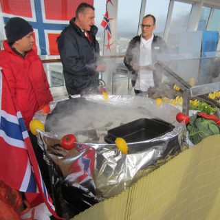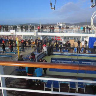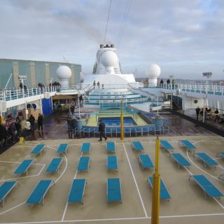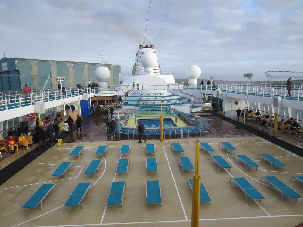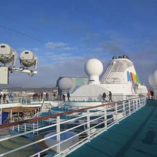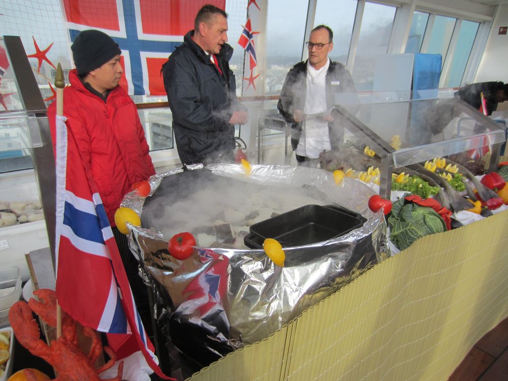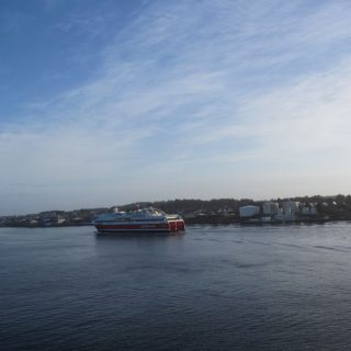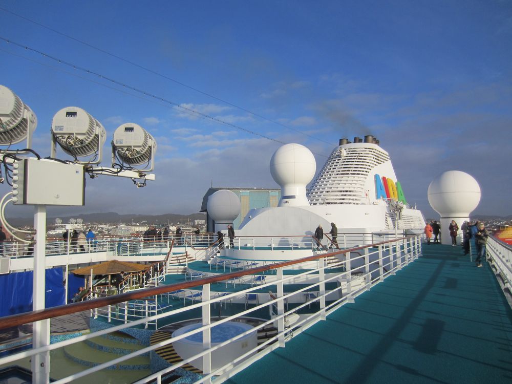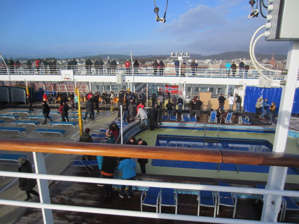 Nachtrag zu gestern: das Auslaufen war super, allerschönster Sonnenschein, ein Gläschen Sekt dazu und die bekannte „sail away“ – Melodie. 3 x Gehupt, Gänsehautfeeling. Der zeitgleich auf dem Pooldeck angebotene norwegische Skrei mit warmen Kartoffelsalat -kostenfrei- dazu war ebenfals klasse. Hier ein paar Bilder dazu: