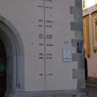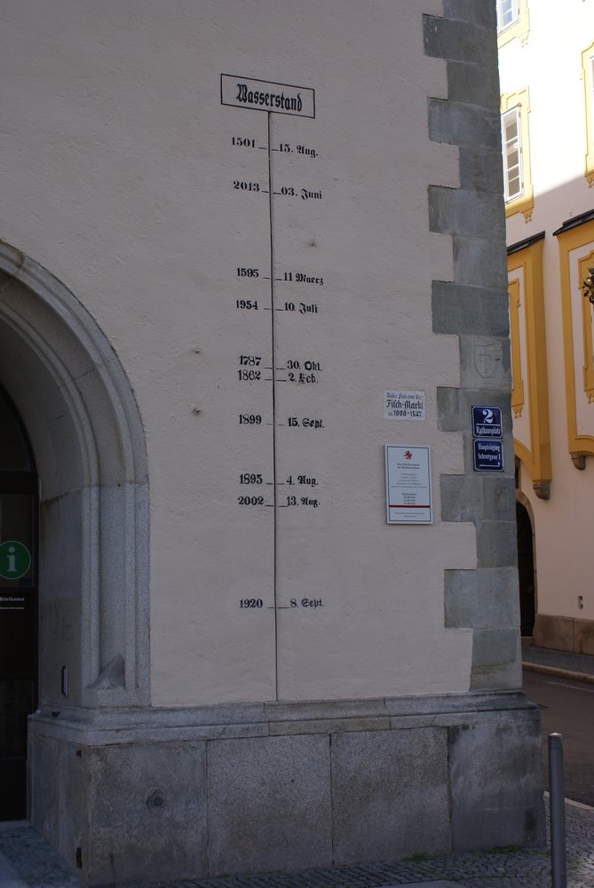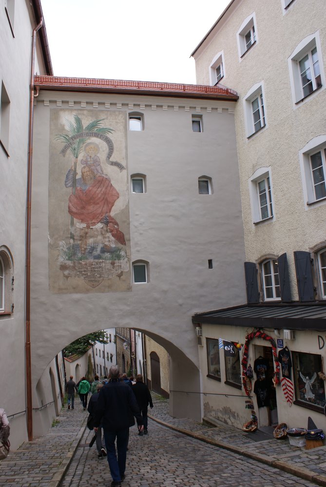 Aber langsam: wegen der blöden Autobahn A 3 und der dauernden Staus etc. sind wir Landstraße gefahren. Schlechte Entscheidung, da einige Brummis denselben Weg hatten. Gegen 10 waren wir in Passau angekommen und parkten ggü. in „Innstadt“, einmal über die Brücke gelaufen und schon waren wir mittendrin. Schnell den Innenhof vom Dom gesucht, weil dort die Konzertkarten ab 10 zu bekommen waren, nach unseren Infos sehr begehrt. Puh, geschafft, nun zum Hauptportal, weil dort die Führung beginnen sollte. Auch kein Problem, Führung war sehr informativ. Vom Dom ging es die „Pfaffengasse“ hinunter in die „Hölle“ (Höllgasse), Hochwassermarken ließen uns staunen, guckst Du mal ein paar Bilder dazu:
