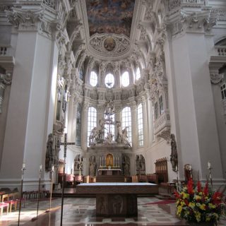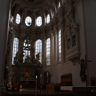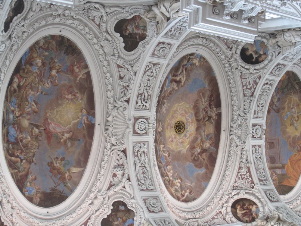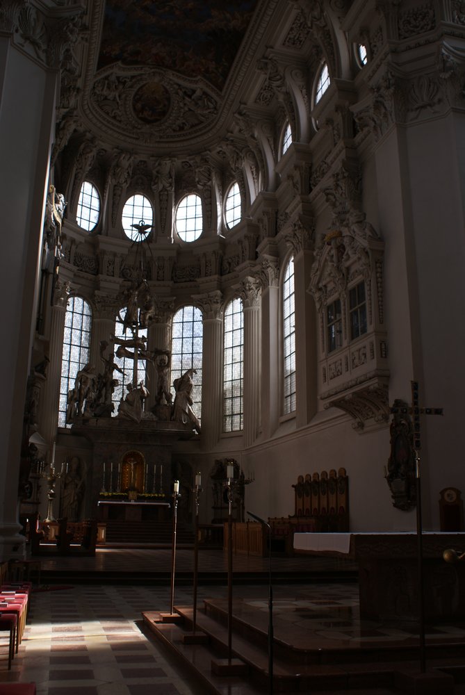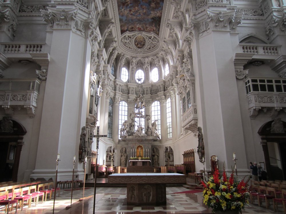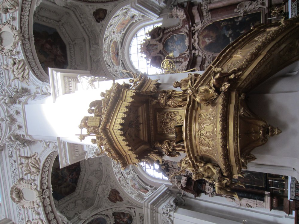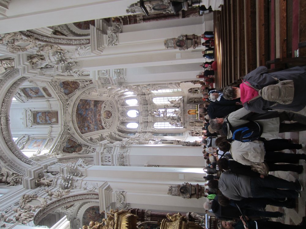 Nach dem Rathaus ging es noch vorbei am „Schafrichterhaus“ zum ehemaligen Jesuiten-Kloster, was als Kirche heute nicht mehr genutzt wird, aber gemietet werden könne (Hochzeiten etc..). Anschließend runter zum Inn mit Blick auf die Kirche „Mariahilf“. Wir erfuhren viel auf dieser Führung. Danach wieder rauf zur „Residenz“ auf der Rückseite vom Dom. Die ganze Altstadt war sehr gut erhalten, waren doch kaum Bombem im Krieg auf sie gefallen.