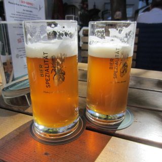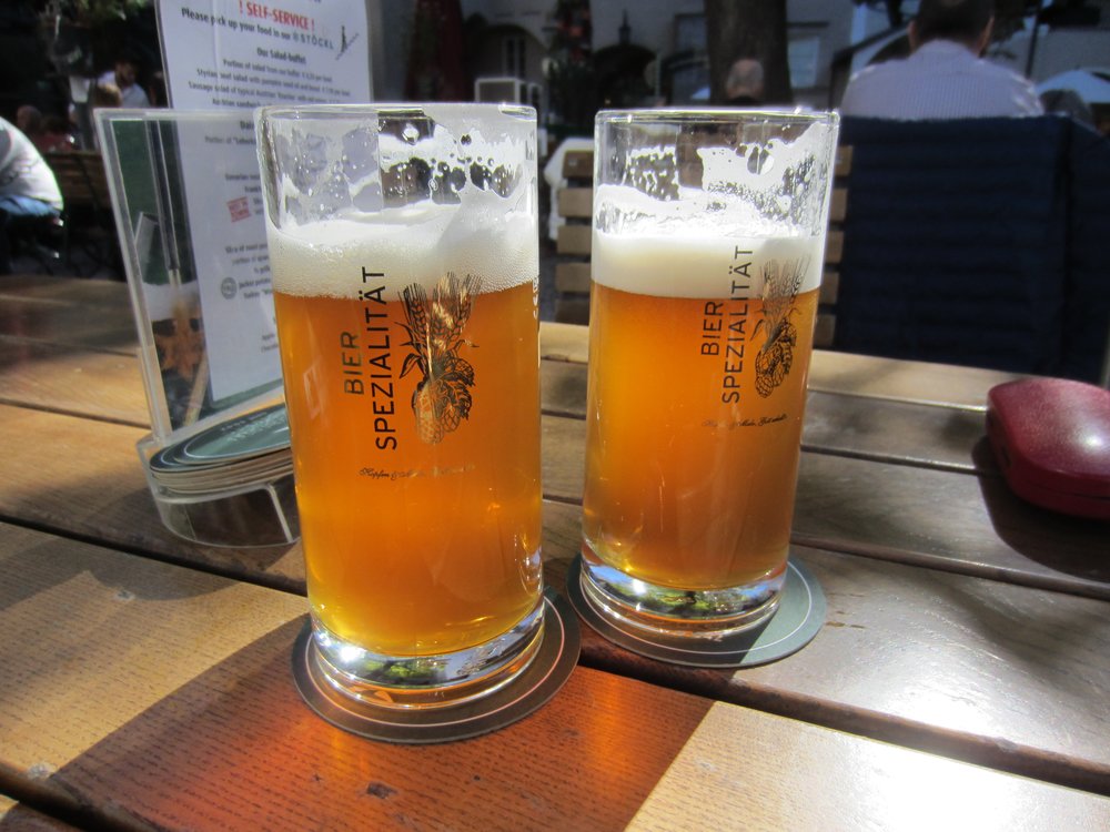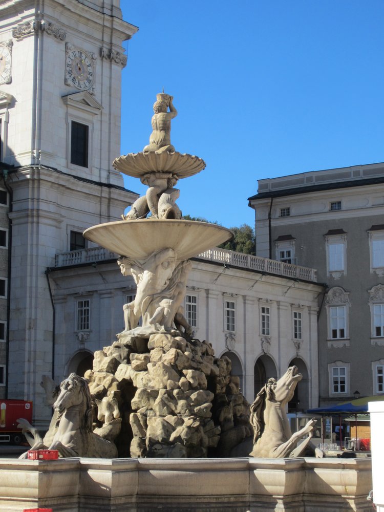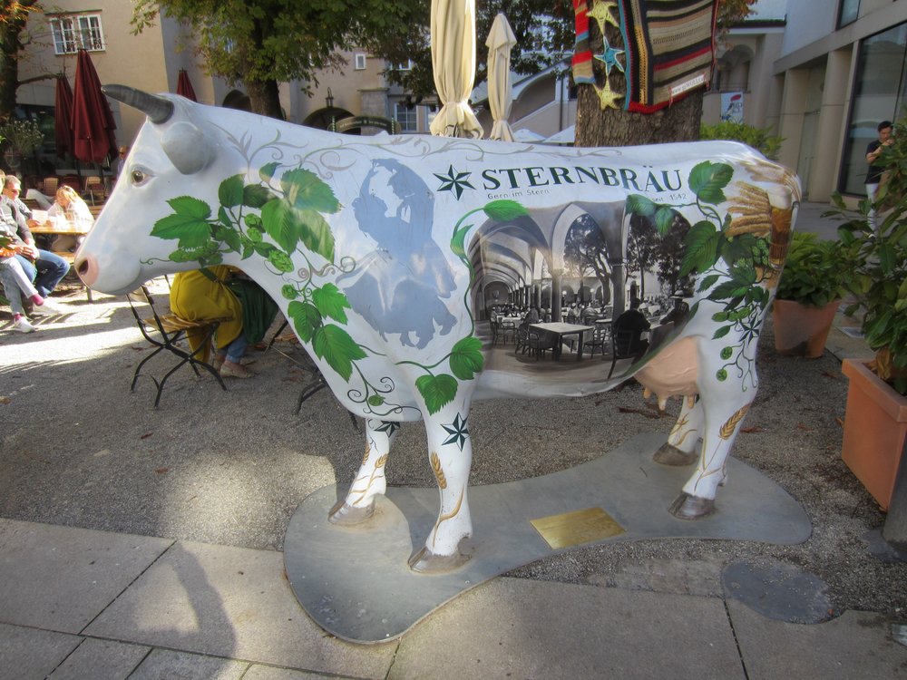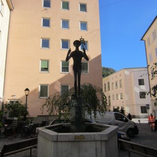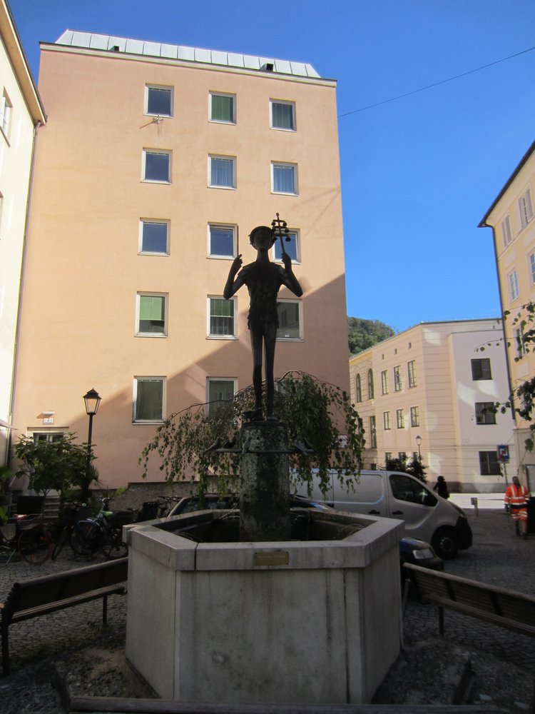 Genau! Wer uns kennt, weiß Bescheid 🙂 . Das Örtchen hieß dann „Sternengalerie“ (https://de.wikipedia.org/wiki/Sternbr%C3%A4u_(Salzburg) ), wir saßen im „Gastgarten“ (= Biergarten) in der Sonne und chillten und genossen Speis und Trank. Das Bier war übrigens sehr schmackhaft 🙂 Im Anschluß machten wir uns dann auf den Rückweg und gingen die Getreidegasse bis zum Ende, dem Mozartplatz. Unterwegs noch schnell ein Entchen für Bea + Holger geschoppt, ließen wir die Original Mozartkugeln vom „Fürst“ links liegen, vlt. nächstes Mal.