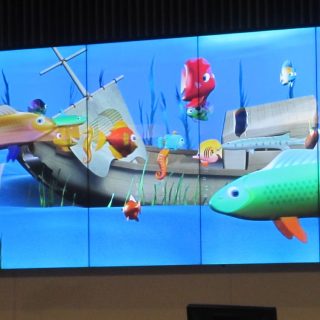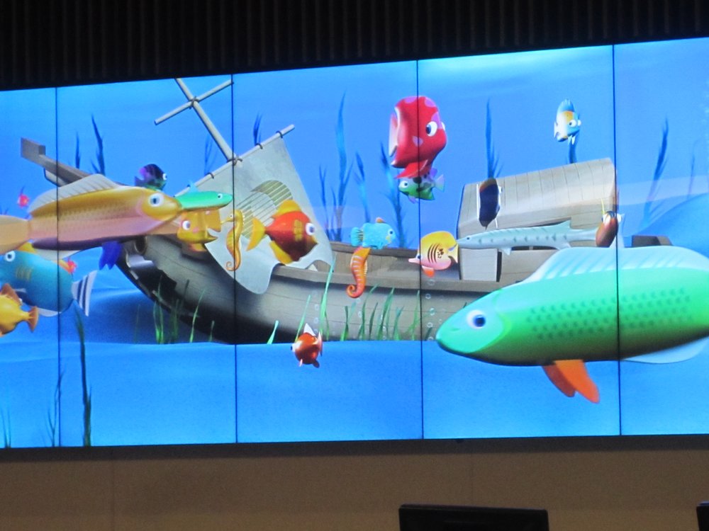 Als sich dann (endlich) gegen 15:30 am Lufthansa-Schalter was bewegte, haben auch wir uns etwas später in die Schlange eingereiht. Auf dem Display oberhalb der Schalter haben sie schöne Animationen, das verkürzt die Wartezeit ein wenig 🙂