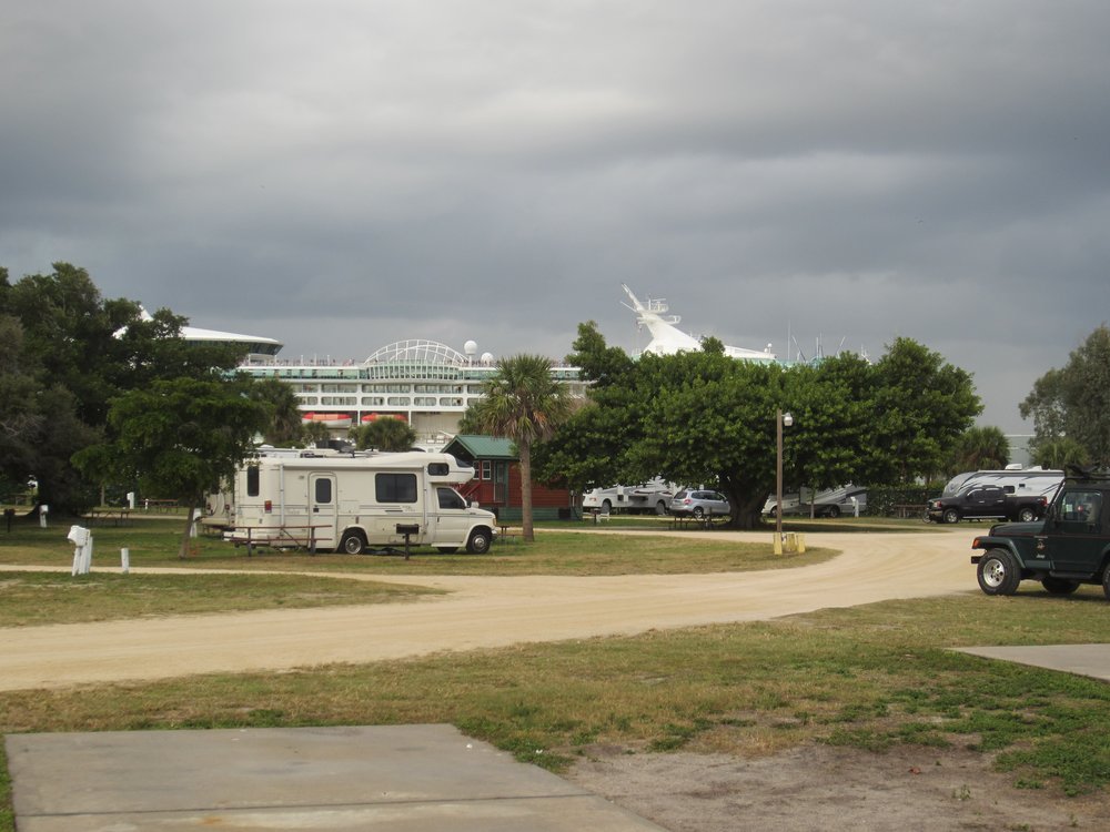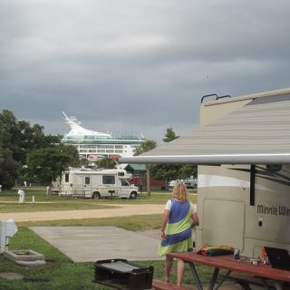Wir haben heute 3 Stunden in der Sonne gebrutzelt, dann waren einige Stellen rot bei Frauchen. Ist ja morgen alles braun 🙂 Natürlich. Am späten Mittag und nach dem Duschen sind wir dann noch außerhalb zum „water’s edge cafe“ gegangen, ein Bierchen schlabbern. Dort haben uns die „no see ums“ gepiesackt, die in ganz Florida eine Plage sind. Wir waren nicht eingeschmiert, wir doofies 🙁 Jetzt am Nachmittag und gegen 16:00 mit 28° hat es noch etwas geregnet. Macht nix, wir sietzen unter der Markise vor dem WoMo und genießen die Temperaturen, eingeschmiert. Heute Mittag fuhr das Casino-Boot, für kanpp 30 $ p.P inkl. Mittagssnack hätten wir mitfahren können und zocken. Wollten wir aber nicht. Heurte früh gegen 6 kam ein Kreuzfahrer rein, der hatte schön getutet. Jetzt gerade fuhr eine kleine Royal Caribbean raus. Gleich werden wir wohl noch den Grill anschmeißen, soweit es trocken bleibt bzw. der Regen nicht zu stark wird. Die Markise ist so groß, da kann auch der Grill drunter arbeiten 🙂