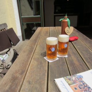Wegen der großen Gesellschaft gab es eine verkürzte Karte, die uns aber nicht zusagte. Man hätte auch ans „Buffet“ gehen können, funktionierte wie in einer Kantine: Aussuchen, auf den Teller legen, am Ende nach Gewicht bezahlen….. wollten wir auch nicht: Haxe/Rippchen und all so schwere Sachen 🙁