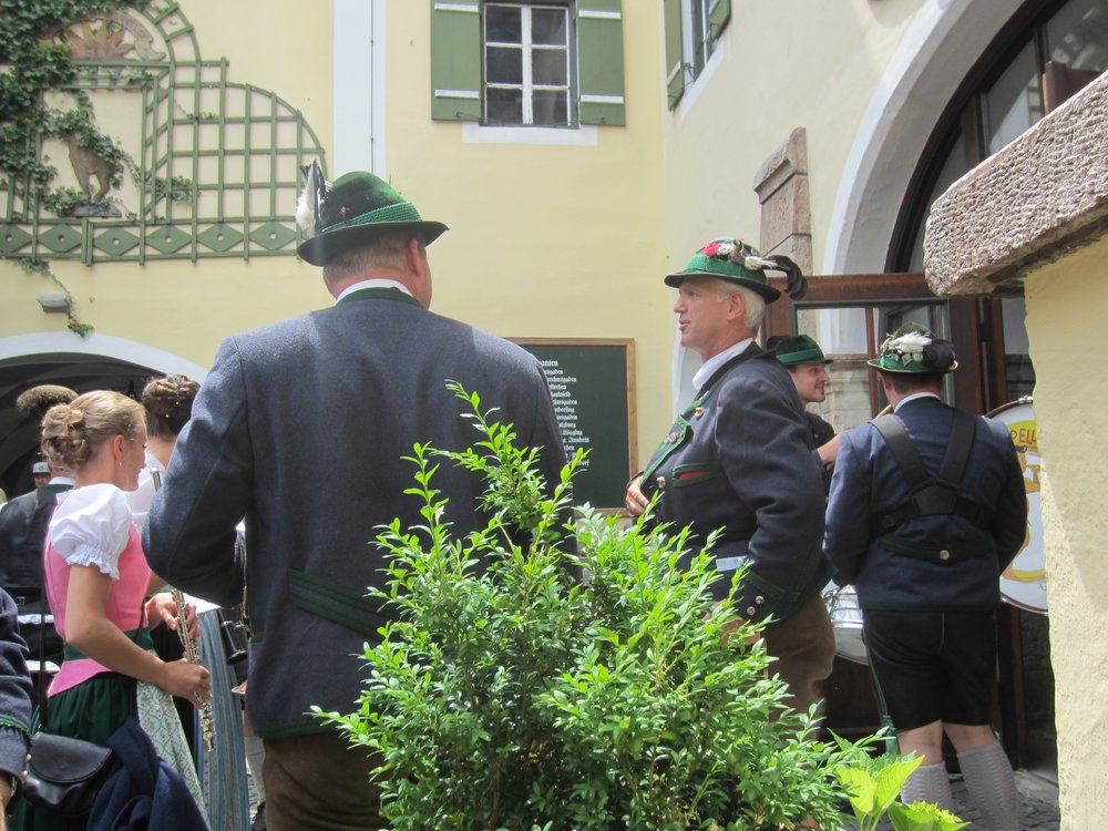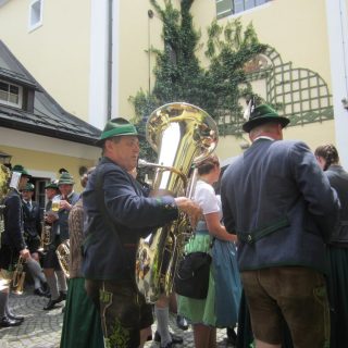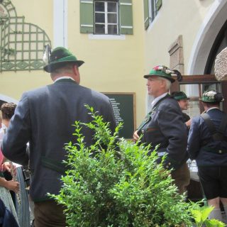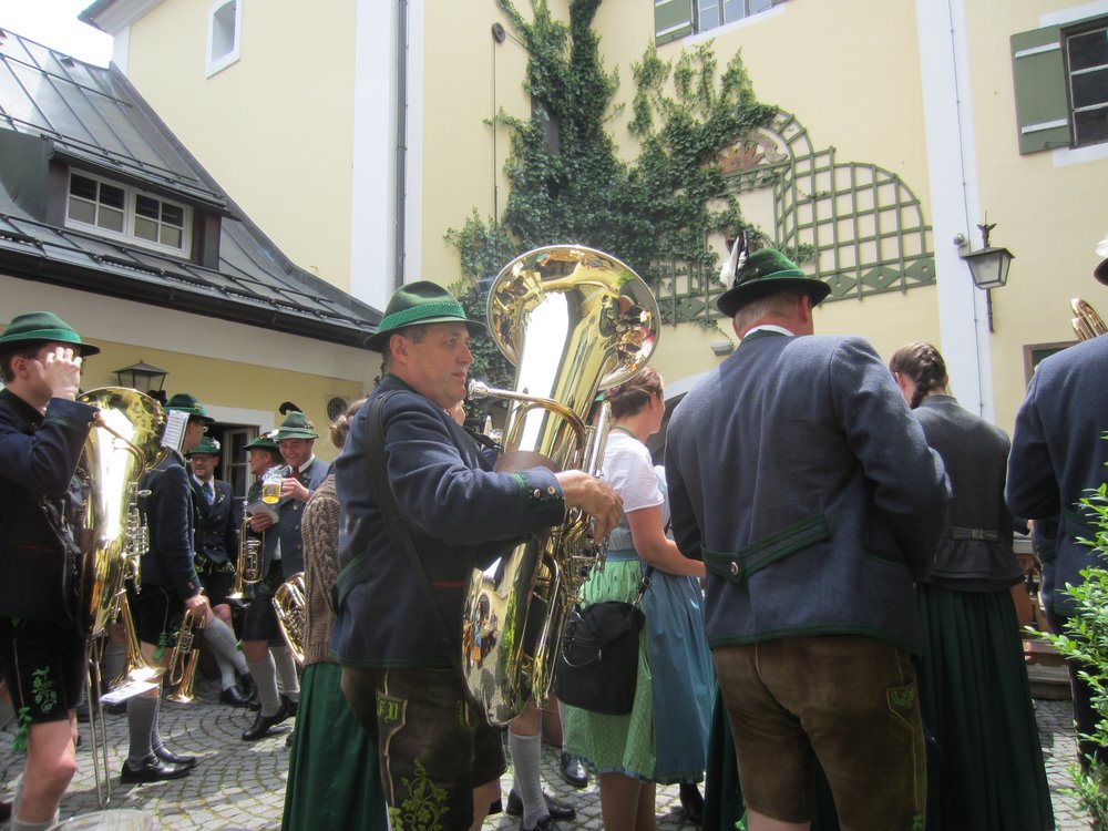 Samstag sollte eigentlich die Bergbahn in Ösiland (Untersbergbahn, ich hab’s gefunden) dran sein. Da die Wolkendecke aber relativ tief lag, haben wir getauscht und sind mit dem Bus zur Brauerei gefahren. Das ist sehr praktisch, dass mit unserer Gästekarte der Bus nichts kostet 🙂 Wir kamen gegen 11:30 im Braustüberl an (guckst Du: http://braeustueberl-berchtesgaden.de/ ) und es war total leer. Ein wenig Sonne schien, so setzten wir uns nach draußen, neben dem Eingang zur „Malztenne“. Da drin hatten die Kellner bereits für ca. 300 Leute die Tische gedeckt, Salate standen auch schon. Die Hochzeitsgesellschaft sollte gegen 12 kommen. Wir hatten total günstig, durften wir dem Einzug aus erster Reihe zuschauen. Erst die Männer, alle in Tracht und Hut mit Gamsbart. Dann folgte das Brautpaar mit Brautjungfern und dann die Damen. Alles natürlich begleitet von der „Marktkapelle“ Berchtesgaden ( https://www.marktmusi.de/) mit Live-Tamtam, der übrigens auch die Braut angehört. Alle Damen/Mädchen natürlich im Dirndl. Ein tolles Spektakel 🙂